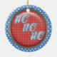 Vermelho com pontos brancos num lado do ornamento, azul com pontos brancos no verso, Papai Noel e texto que diz "Ho Ho Ho" em um ornamento de porcelana que é muito fofo para desmaiar!