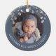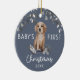 Este lindo design de aquarela apresenta um lindo cãozinho Ouro de Retriever sentado em uma cama de flores silvestres, verde de inverno e folhagem na frente, as palavras Primeiro Natal do Bebê e o ano. Personalize na frente com o ano e atrás, coloque a foto do bebê e seu nome à volta da borda. O perfeito Enfeites de natal neutro de gênero para um bebê OU menina, faz do seu primeiro Natal uma memória mágica para os próximos anos.