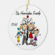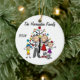 Uma cerâmica redonda bonito guardando o enfeite de Natal apresenta um pai de figuras de palitos, mãe, garotinho em um boné de bola azul, uma garota de vestido roxo, e um gato diante da árvore de Natal decorada e áreas onde você pode adicionar texto incluindo o ano atual e o nome da família. Este é um presente adorável para qualquer família comemorar o ano!
