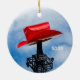 Dois ornamentos laterais que apresentam o contorno do estado do Texas em um deles e a Torre Eiffel de Paris, Texas, no outro.