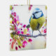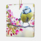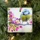 Ornamento com uma fotografia espantosa do pequeno pássaro mais bonito empoleirado num galho coberto de flores cor-de-rosa e folhas verdes. O pássaro tem uma cabeça azul e corpo amarelo com um rosto muito doce. Adorável.