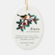 Pássaro de inverno do Céu e da Natureza no Enfeites de natal de Oval Holly Cerâmica... Um doce pássaro de inverno permeia picantes coloridos de groselhas vermelhas ocas no nosso Enfeites de natal de cerâmica oval de estilo vintage com o título "Céu e Natureza Cante" na escrita e na tipografia serif clássica. Uma saudação de Natal sincera diz: "Desejando-lhe paz, amor e alegria nesta temporada de festas e ao longo do próximo ano." Personalize com a sua assinatura e ano imediatamente abaixo dos desejos de férias. Todo texto pode ser facilmente revisado no modelo de personalização.