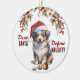 Na frente deste ornamento de Feriado está a imagem de um filhote australiano bonito de pastor vestindo um chapéu vermelho e branco de Papai Noel. Ele se senta com um ornamento de árvore quebrada na frente dele. O texto vermelho diz "Caros PAPAIS NOEIS Definem NASCIDOS". No verso, o texto vermelho e verde diz MERRY CHRISTMAS", e há campos de texto adicionais para você personalizar o que quiser.