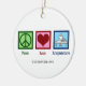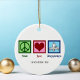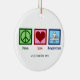 Um Enfeites de natal acupunturista bonitinho com um bonito sinal verde de paz, coração vermelho, e uma pessoa praticando bem-estar e tratamento da dor através da acupuntura. Presente de Acupuntura de Paz e Amor.