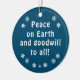 Ornamento de texto azul e branco com design de floco de neve. Paz na Terra e boa vontade para todos. Penso que é a mensagem perfeita para o ambiente de hoje. Lembre-se de todos. Aspecto profissional, adequado para ofertas de negócios ou uso pessoal.