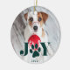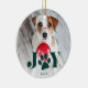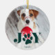 Dê a seu amigo peludo um lugar especial na árvore este Natal com nosso ornamento de fotos de animais de estimação de Paws festivos. Design apresenta a sua foto favorita de cão ou gato com "JOY" sobreposta no tipo verde caçador. Uma ilustração de pata doce substitui o "O". Personalize com o ano abaixo. Ornamento se inverte para revelar um padrão festivo de suéter nórdico em verde e branco de floresta.