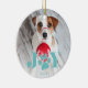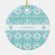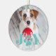 Dê a seu amigo peludo um lugar especial na árvore este Natal com nosso ornamento de fotos de animais de estimação de Paws festivos. Design apresenta a sua foto favorita de cão ou gato com "JOY" sobreposta no tipo de turquesa. Uma ilustração de pata doce substitui o "O". Personalize com o ano abaixo. Ornament reverte para revelar um padrão festivo de suéter nórdico em aqua e branco.