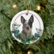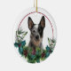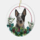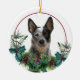 Na frente deste ornamento de Férias está um belo retrato de um Cão de Bovinos australiano azul saltando de uma tosse sagrada e verde. Morangos vermelhos e cones de pínus decoram os sprigs de pinho e sprigs de pinho. A imagem é colocada em um círculo branco dentro de um círculo fino de linha vermelha. A parte de trás do ornamento tem a mesma coroa verde e círculo com seu texto personalizado em vermelho.
