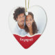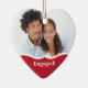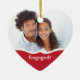 Este ornamento moderno é um excelente de um noivado de casal. Ele apresenta uma borda curva com a palavra "Engaged!" e uma foto do casal feliz na frente. O fundo tem uma cor sólida com os nomes e a data do noivado. Este ornamento atraente faz um presente personalizado excelente.