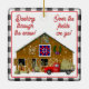 Pequeno Caminhão Vermelho com Raça Cavalo na cena de inverno com queda de neve - apresentando o trabalho de arte original do Rick Ellinger do seu "Pequeno Caminhão Vermelho na Aldeia do Campo". Circulo LRT Ranch e caminhão de feno. Natividade no feno. Texto "Piscando na neve! Sobre os campos que vamos!"