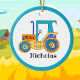 Desenho de trator infantil colorido em blues e amarelos com o ano e o nome do menino.