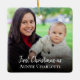 Personalize este elegante Enfeites de natal com duas faces, com as palavras "Primeiro Natal Como", em uma caligrafia manuscrita branca, com seu próprio nome de tia, nome de tio, nomes de casados, ou o que você escolher, e suas próprias fotos e o ano. Um presente maravilhoso para o novo tio, tia, recém-casados, casal ou casal casado.
