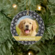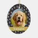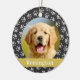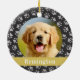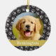 Este adorno de feriado personalizado elegante pode ser personalizado com uma fotografia fofa do seu cão de estimação (ou gato) e do seu primeiro nome. Inclui uma cor de fundo preto macio com uma banda monográfica dourada e um padrão de impressão de pata prateada. Faz um presente de Natal único para amantes de cães ou para celebrar o primeiro Natal do filhote!