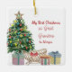 My First Christmas as Great Grandma to ... personalized with the new grandchild's name, the year and a photo on the back. The design features a lit christmas tree with crib and gift wrapped presents. Sweet new baby themed holiday ornament keepsake to celebrate a new addition to your family this year.