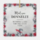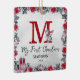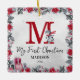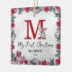 Um enfeites de natal vermelho bonito para bebês, com um fundo de cinza lavado, flores e folhagem elegantes para o Natal, adoráveis pinguins para bebês, boneco de neve, presentes, os bebês iniciais, nome, ano, o ditado "meu primeiro natal" e as estatísticas do bebê.