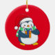 Ornamento De Cerâmica Pinguim num chapéu de Natal com um presente