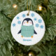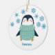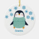 Um pinguim bonito em um suéter teal sob lindos flocos de neve azuis. Personalize este belo presente de feriado com o nome de um amigo para um adorável Enfeites de natal personalizado.