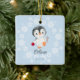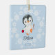 Pinguim giro, datado e personalizado, segurando uma bola de Natal e uma bengala doce sobre um fundo azul claro com uma moldura de floco de neve. Um presente de Natal Maravilhoso que certamente será precioso por muitos anos.