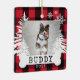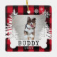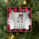 Fazenda rustica, árvores de Natal frescas, ornamento de manutenção de fotos de animais de estimação. O ornamento pode ser personalizado com o nome do animal de estimação, o ano e a foto. Fundo de xadrez de pranchas vermelhas com pinheiros rústicos e flocos de neve. O nome do animal de estimação aparece num osso branco de cão. Trabalho de arte por Moodthology Papery.