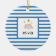Elegante, moderno e fofo ornamento à volta de fotos de bebês no padrão de faixa azul marinho. Este modelo com uma ilustração adorável de dinossauro bebê rosa dormindo sob as estrelas amarelas douradas com o nome personalizado de Baby. Excelente para o bebê e para a menina. Presente perfeito para todas as estações!