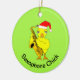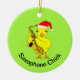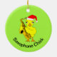 Um pintinho amarelo bonito segurando um sax e vestindo um chapéu de Papai Noel é um design de presente engraçado para músicos nas férias de inverno. O texto pode ser alterado.