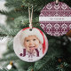 Enfeite festivo e doce mostra sua foto favorita com "JOY" encapotada em cartazes de ameixa. A ilustração do floco de neve substitui o "O". Personalize com o ano abaixo. Ornamento reverte para revelar um padrão festivo de suéter nórdico.