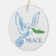 Este Enfeites de natal de metal redondo apresenta uma pomba branca segurando um ramo de oliveira e a palavra "Paz".