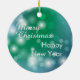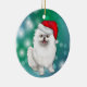Na frente deste ornamento de Feriado está uma imagem de aquarela de um pequeno cão Pomerano branco vestindo um chapéu vermelho brilhante de Papai Noel. A imagem destaca-se em relação a um fundo verde gradiente e a um fundo azul. A parte de trás do ornamento tem o mesmo pano de fundo com texto branco personalizado que diz atualmente "Feliz ano novo Feliz de Natal". Bonita para qualquer um, mesmo que não seja "detida" por um Pom!