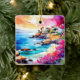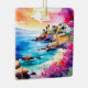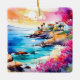 "Praia Secludida". Uma praia mediterrânica Secludida com um mar azul tranquilo é enquadrada por bonito flores rosa e roxas. Um lugar tranquilo e relaxado para contemplação.