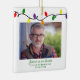 Memorial para sempre em nossos corações Moderno, mas rústico ornamento de Natal com uma adorável sequência de luzes coloridas em vermelho, verde, amarelo e roxo, juntamente com tipografia moderna. Adicione 2 das suas fotos favoritas para o ornamento perfeito! Entre em contato conosco em cedarandstring@gmail.com se precisar de ajuda com o design ou produtos correspondentes.