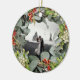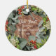 Um belo Enfeites de natal festivo que mostra uma foto do seu dia de casamento posicionado dentro a coroa de Natal de Eucalipto e groselhas vermelhas. O inverso mostra as palavras "Nosso Primeiro Natal como Sr. & Sra. Surname e date" com um fundo de madeira rústico. Presente ideal para recém-casados.