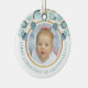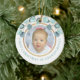 Este Enfeites de natal personalizado apresenta um moderno design botânico de folhagem de eucalipto com elementos falsos de ouro. Personalize a foto, o ano e o nome no verso. Este modelo funciona melhor com fotos de formato paisagem com o bebê no centro.