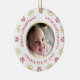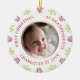 Este Enfeites de natal cerâmico avô apresenta um floco de neve festivo e design de morango com foto e ouro falso. Personalize-o com uma foto e seu texto. Este modelo funciona melhor com fotos de formato paisagem com o bebê no centro.
