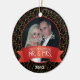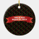 Este ornamento da árvore de Natal ilustra um fundo preto com um círculo verde e vermelho e o texto: Primeiro Natal como Sr. & Sra. A frente tem um quadro fotográfico personalizável para você adicionar sua foto de casamento favorita e uma data personalizável para você adicionar o ano do seu casamento. A parte de trás contém texto personalizável para você adicionar seus nomes e data de casamento. Este ornamento é um presente de Natal perfeito para a nova noiva e noiva.
