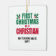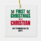 Na moda PRIMEIRO NATAL COMO UM Novo Ornamento Cerâmico CRISTÃO, COM TEXTO E DATA PERSONALIZÁVEIS. A design mostra a tipografia serif verde-natalina e vermelho-natalino com elementos vermelhos e vermelhos holly. Um ornamento cerâmico festivo excelente para um novo crente cristão. Você pode PERSONALIZAR O TEXTO com seu nome, verso de Bíblia favorito ou outro texto e ano (ou excluir). Ideal como mercadoria de Natal da igreja para novos crentes celebrando seu primeiro Natal cristão. Presentes correspondentes disponíveis.
