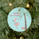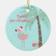 NewParkLane - O Primeiro Ornamento de Natal do Bebê, apresentando duas cenas tropicais com um flamingo rosa bonito vestindo um chapéu de Papai Noel, e uma palmeira decorada com presentes de Natal, contra um fundo azul aqua. Veja esta coleção para itens correspondentes! Você tem desejos pessoais específicos de design? Sinta-se livre para me contactar!