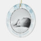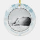 Comemore o primeiro Natal da sua baía recém-nascida com este elegante ornamento personalizado de azul gelado e brilho prateado. Este ornamento é totalmente personalizável! Você pode editar o texto e adicionar sua própria foto clicando em "personalizar esta modelo". Este ornamento de flocos de neve de inverno tem um espaço para você adicionar sua foto de bebê, nome de bebê e ano. Ele apresenta um plano de fundo azul branco, branco e cintilante prateado com flocos de neve e um quadro redondo brilhante prateado que rodeia a foto do bebê. Excelente azul de inverno maravilhoso esquema de cores para um elegante ornamento personalizado de "Primeiro Natal do Bebê".