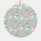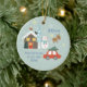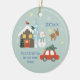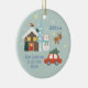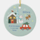 Enfeites de natal de porcelana Whimsical para comemorar seu primeiro Natal em sua nova casa. Um bonitinho bonitão e rena estão ao lado da casa e um passarinho fofo senta no telhado. Um pequeno carro vermelho está levantando com uma árvore de Natal no telhado. Há um lugar para personalizar com o ano. Se quiser, pode mudar a personalização para o que quiser, ou seja, primeiro Natal juntos, primeiro Natal como marido e mulher, etc. O lado inverso tem um padrão de homens de neve e diz "Deixe-o nevar".