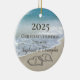 Ano, nomes e iniciais. Celebre o seu noivado enquanto planeja uma praia casamento ou lua de mel com este enfeite de noivado. Corações entrelaçados de casamento na praia desenhados na areia fazem um tema náutico elegante tropical oceano litorâneo ou presente de festa de noivado de casamento de cruzeiro. Ondas de água turquesa bonitas quebrando na costa e céu azul pastel.