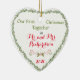 Um adorável e simples ornamento diz Nosso Primeiro Natal Juntos como Sr. e Sra. (seu sobrenome) e o ano. A madura verde e as frutas vermelhas rodeiam a borda do ornamento cardíaco. No verso está um delicioso spray de verdura, uma poinsettia, bagas e ornamentos com dois cardeais vermelhos sentados entre os verdes. É realmente um belo ornamento de manutenção!