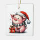 Ilustração cômica de um porco bonitinho em um chapéu de Papai Noel com um presente embrulhado impresso em um ornamento cerâmico comemorando o primeiro Natal do bebê. O texto no verso pode ser alterado. Imagem assistida por IA adquirida com uso comercial. Trabalho de arte: RedHeronLighthouse