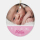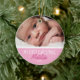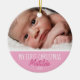 Garota personalizada mantém um enfeites de natal rosa com 2 fotos do seu bebê fofo, as palavras "meu primeiro natal", o nome e o ano.