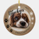 Cute First Puppy Christmas Rustic Dog Name e Photo Cerâmica Ornament. O fundo é bege rústico com flocos de neve brancos e estampas de pata preta. Personalize o ornamento com a foto, o nome e o ano de nascimento do seu cachorro - insira sua foto favorita do filhote. Você pode usar este ornamento personalizado para qualquer animal de estimação. Uma adorável guarda de férias para um dono de cachorro.