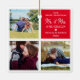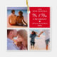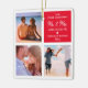Colagem de fotos com o enfeites de natal de 2021, que apresenta um fundo branco-quic que pode ser mudado para qualquer cor, 3 fotos de você e seu parceiro, as palavras "nosso primeiro natal mr & mrs", um coração bonito, seus nomes e o ano. No verso estão outras 3 fotos para você personalizar.
