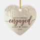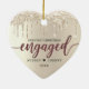 Para o seu primeiro Natal engajou este adorno cardíaco personalizado chic de férias para casais mostra uma fronteira de champanhe pingando brilho com um design de tipografia em verde e escrita burgundy lendo, "Nosso Primeiro Natal Envolvido". Personalize com seus nomes e ano. Boa sorte no seu futuro casamento! Desenhada por Susan Coffey.