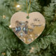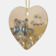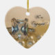 A elegante Princesa e Pérolas Brancas Somos Envolvidos Um Ornamento Formatado pelo Coração pode ser personalizado com os nomes da noiva e do noivo e data que ele propôs. Este elegante costume que estamos noivos apresenta uma fotografia de perto de uma princesa quadrada cortada em anel de noivado de diamante e colar de pérolas brancas.