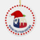 Personalizado DESEJANDO A VOCÊ UM NATAL TEXANO COLOCANDO O ornamento cerâmico com TEXTO PERSONALIZÁVEL. Design mostra a bandeira texana de Lone Star State do Texas na forma de um pudim de Natal e vestindo um chapéu de Santa. E por que não? Por baixo há um TEXTO PERSONALIZÁVEL que diz DESEJANDO A VOCÊ UM NATAL TEXANO QUE VOCÊ PODE PERSONALIZAR ADICIONANDO SEU NOME, fazer este é o presente ideal de estocador de Natal Texano. Ofertas correspondentes disponíveis que farão Papais noeis Secretos excelentes, Elefante Branco ou Itens de Troca Yankee.