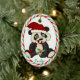 Aqui está um Enfeites de natal bonito para qualquer neto que ame ursos panda. Um panda preto e branco de olhos largos segura uma cana doce e veste um chapéu de Papai Noel. Abaixo da imagem está o nome especial de sua criança em verde. A imagem é moldada com um padrão bonito vermelho, verde e branco de faixa de canas doce. A parte de trás do ornamento tem o mesmo quadro distribuído e mais campos de texto para personalização.