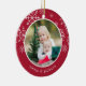 Enfeites de natal festivo apresenta uma foto favorita em cada lado, emoldurada por flocos de neve brancos em vermelho de amora vibrante. Personalize com uma legenda personalizada em cada lado; mostrada com nomes e o ano.