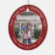 Celebre o fazer através da união familiar em casa com uma foto personalizada de 2 "O Ano em que Sobrevivemos à Quarentena", Enfeites de natal vermelho e branco redondo. Todo texto e imagens neste modelo são simples de personalizar e podem ser diferentes ou iguais em frente e atrás. (DICAS DE IMAGEM e DESIGN DE TEXTO: 1) Para ajustar a posição do texto, adicione espaços no início ou no fim. 2) Para centralizar a foto exatamente como quiser, recorte-a em forma quadrada antes de carregá-la no site do Zazzle.) Design apresenta uma na moda vermelha ombre e borda branca, caligrafia de estilo manuscrito, nome da família e ano e duas fotos da sua escolha. Este ornamento único e moderno de distanciamento social do coronavírus faz uma adição fofa e humorística às decorações de árvores de Natal ou uma ideia engraçada de presente de Natal pandêmico do Covid-19.